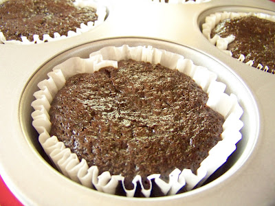 I believe that in the last post, I left off right here. For these king-sized chocolate cupcakes, I used the Double Chocolate Layer Cake recipe that Hilary of Let Her Bake Cake posted this week. She got the recipe from Epicurious, but since I followed her version of the recipe, I'll link her. If you haven't visited Let Her Bake Cake, you should hop over there. Her header alone earns my vote!